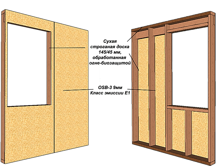 - Каркас дома - стены из сухой строганой доски 145*45 мм - перекрытия и стропильная система из сухой доски 200*50 мм, если иное не предусмотрено «PinUp» - зашивка стен снаружи OSB-3 9 мм;