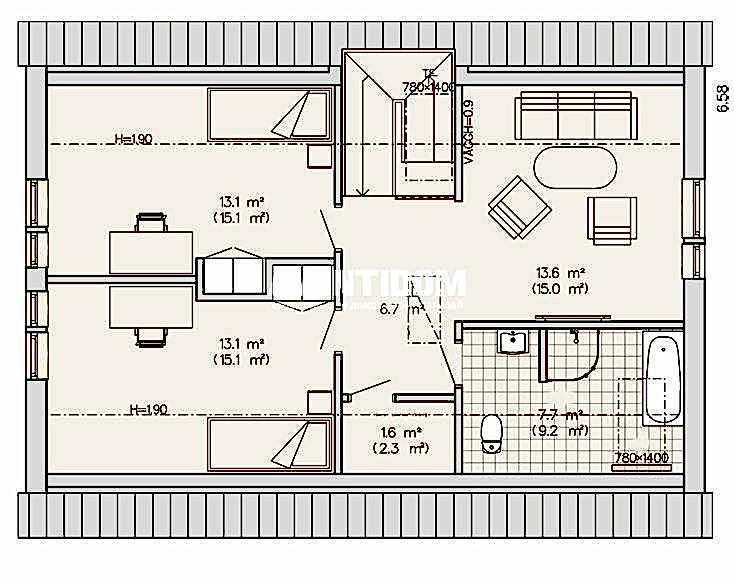 Межэтажная лестница может включать несколько вариаций исполнения. Верхнее «PinUp» позиционируется как семейный сектор. Дополнительные 62м2распланированы на две спальни, наделенные обширными окнами и общую зону. Особый акцент сделан на присутствие индивидуальной шикарной ванной комнаты. Дом максимально уютен и допускает некоторую корректировку интерьерной части проекта.