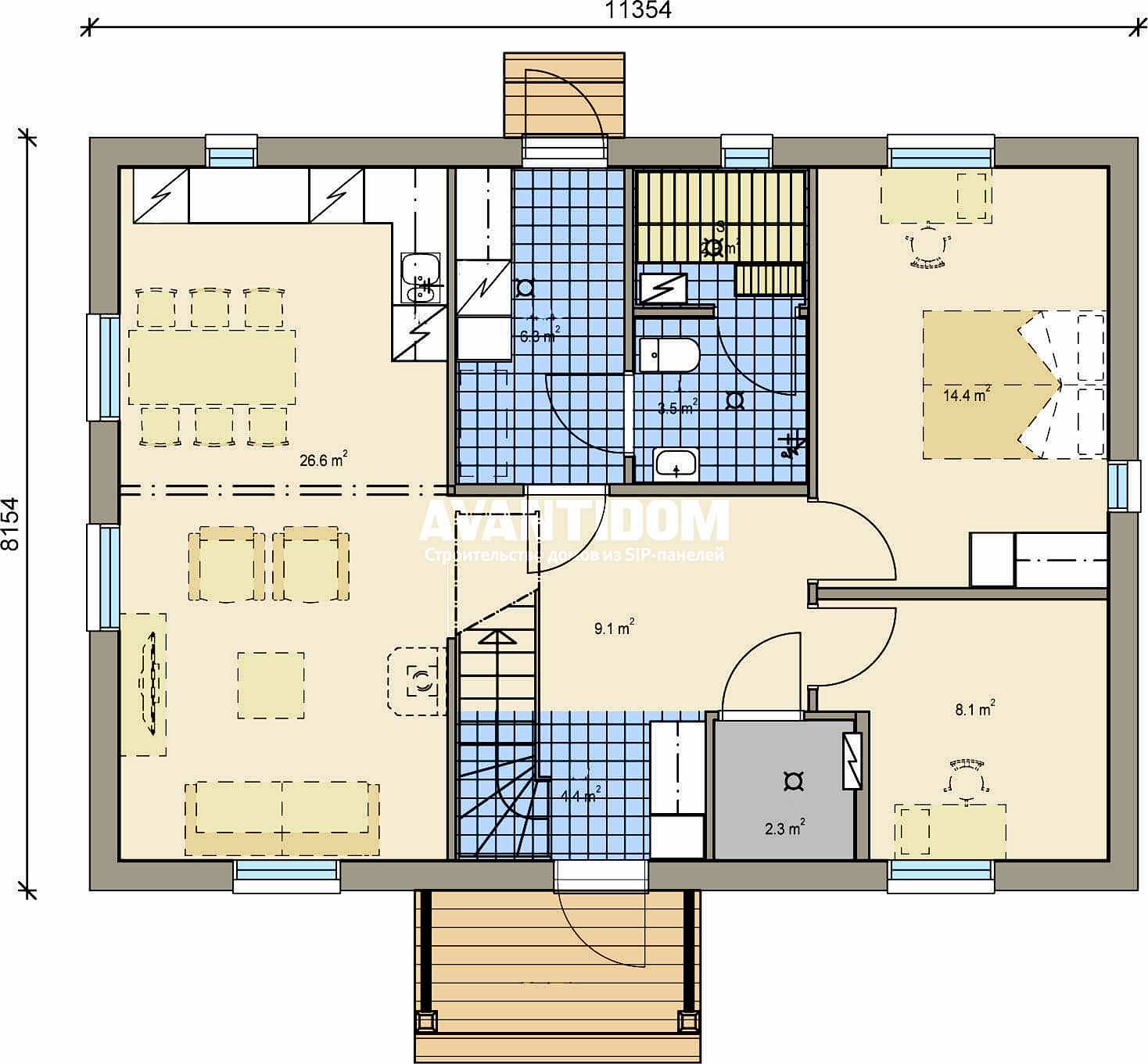 Нижний этаж разметил социальную зону, разделенную с гостевой спальней, прачечной и санузлом. Кухонный сектор по «PinUp» расчетам отгорожен перегородкой от гостиной. Для семей, считающих неприемлемым ограждение функциональных сегментов и отдающих предпочтение свободным планировкам, архитекторами компании “Avantidom” будут внесены корректирующие изменения. Мансардное пространство отдано под тихий спальный сектор с двумя вместительными спальнями.