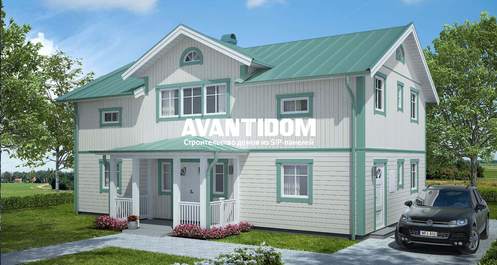 Классический вариант проектного решения с лаконичным архитектурным оформлением и функциональной интерьерной экспозицией. «PinUp» 7 комнат на 182,2 м2общего полезного пространства. Позиционируется дом как 2-этажный. Сочетание светлых и салатовых тонов фасадной облицовки очень гармонирует и подчеркивает индивидуальность. Также архитекторами компании “Avantidom” предложена функциональная разработка внутридомового пространства.