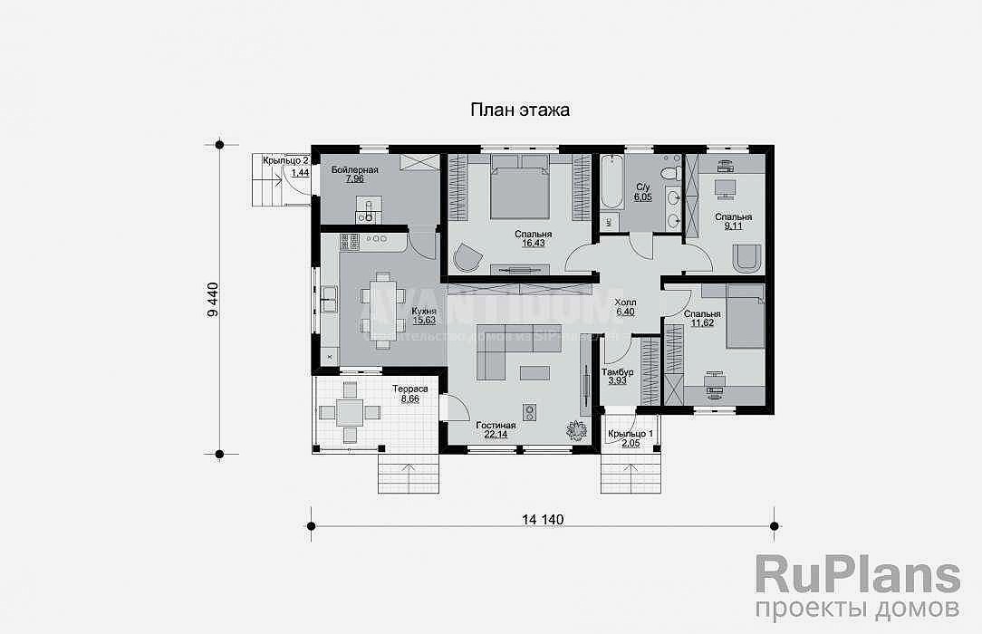 - Размеры дома14,1 x 9,4 м